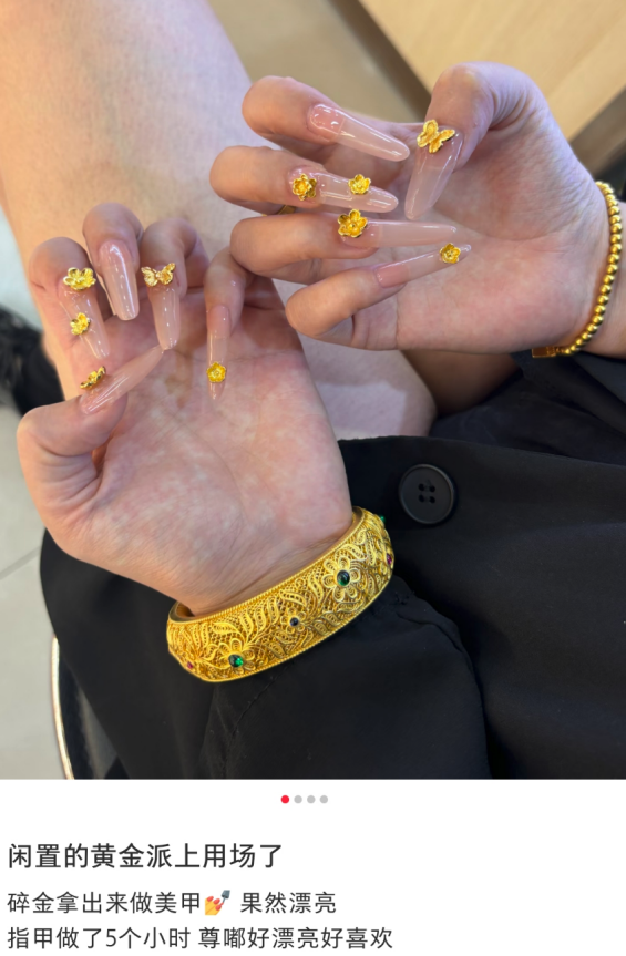 “年终奖发了,给自己做个999黄金美甲”“才做完用了10克”“闲置的黄金派上用场了”……